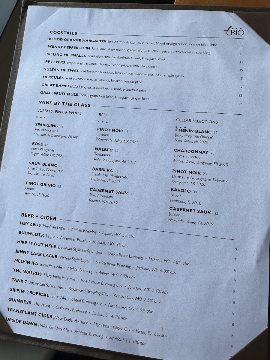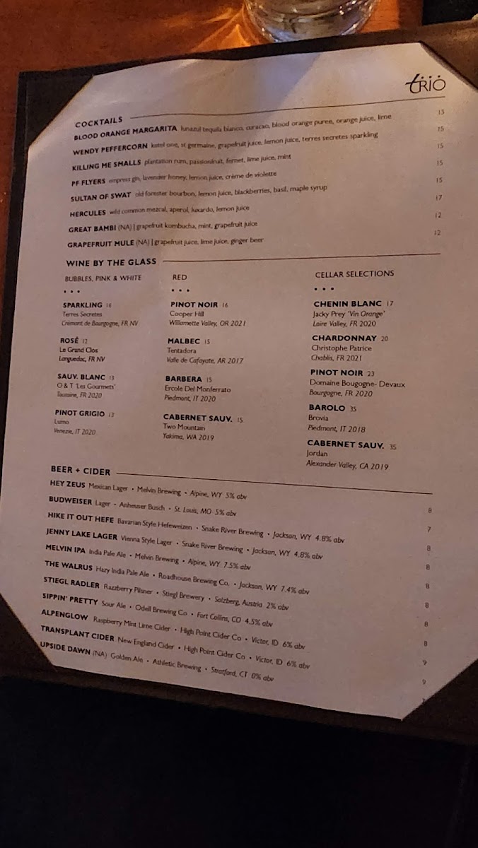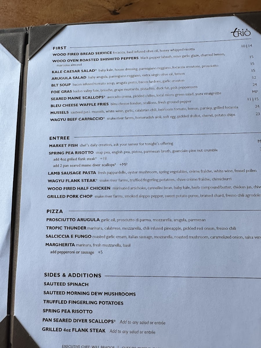 Trio | An American Bistro in Jackson, WY offers a carefully crafted menu that balances bold flavors with fresh, local ingredients. Starting off with an appetizer, the Wood Fired Bread Service provides a deliciously warm and crisp beginning to the meal. You can also opt for the smoky Shishito Peppers, perfect for those who enjoy a touch of spice, or dive into a light yet satisfying Kale Caesar Salad or Arugula Salad, both of which bring vibrant flavors and textures to the table. For a comforting, heartwarming start, the BLT Soup is a standout choice, combining the essence of the classic sandwich in a rich, soup form.